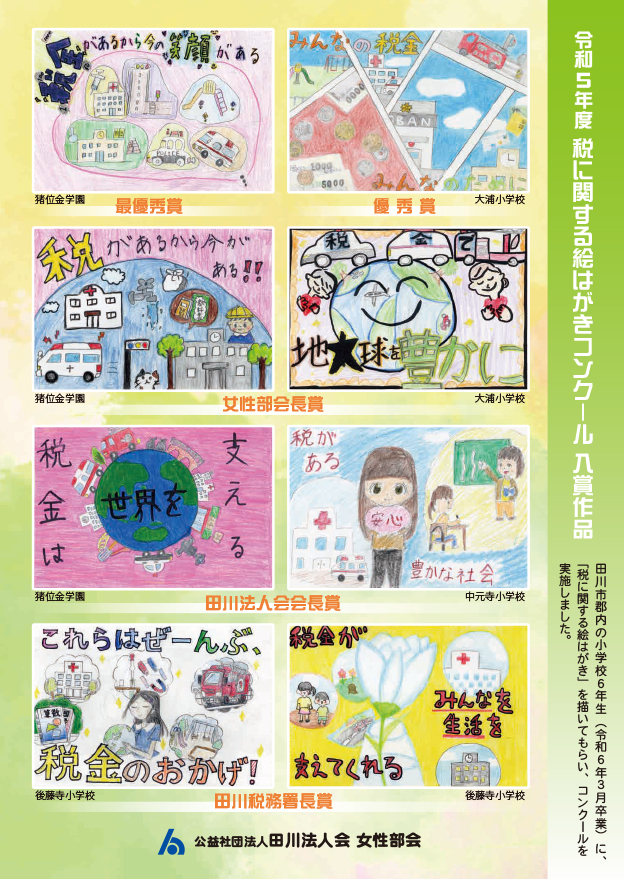 クリアファイルの配布を実施しました 2025年10月14日 最終更新日時 : 2025年10月14日 creative クリアファイルの配布 令和7年2月12日(水)・13日(火) 「税に関する絵はがきコンクール」の優秀作品を掲載したクリアファイルを教育委員会を通じて、管内の小学6年生へ配布しました。